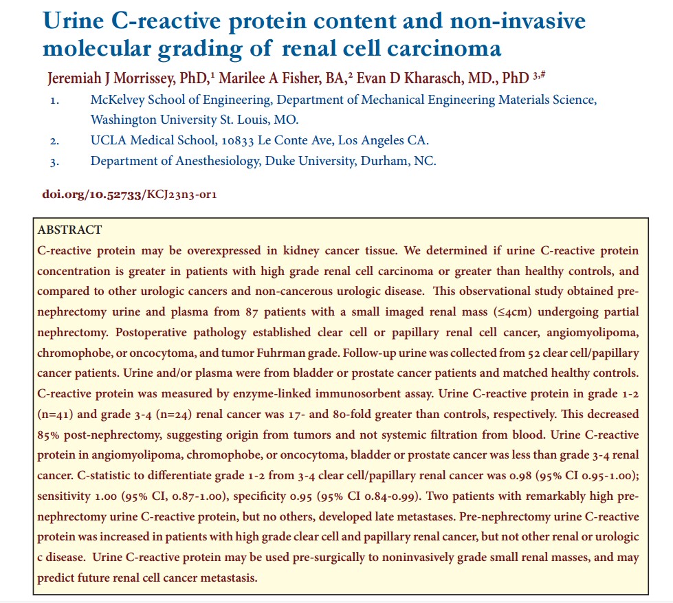 In summary, urine CRP was elevated in high-grade clear cell/papillary RCC and appeared specific versus other renal and urologic diseases. It may serve as a pre-surgical liquid biopsy for grading and metastatic risk prediction.