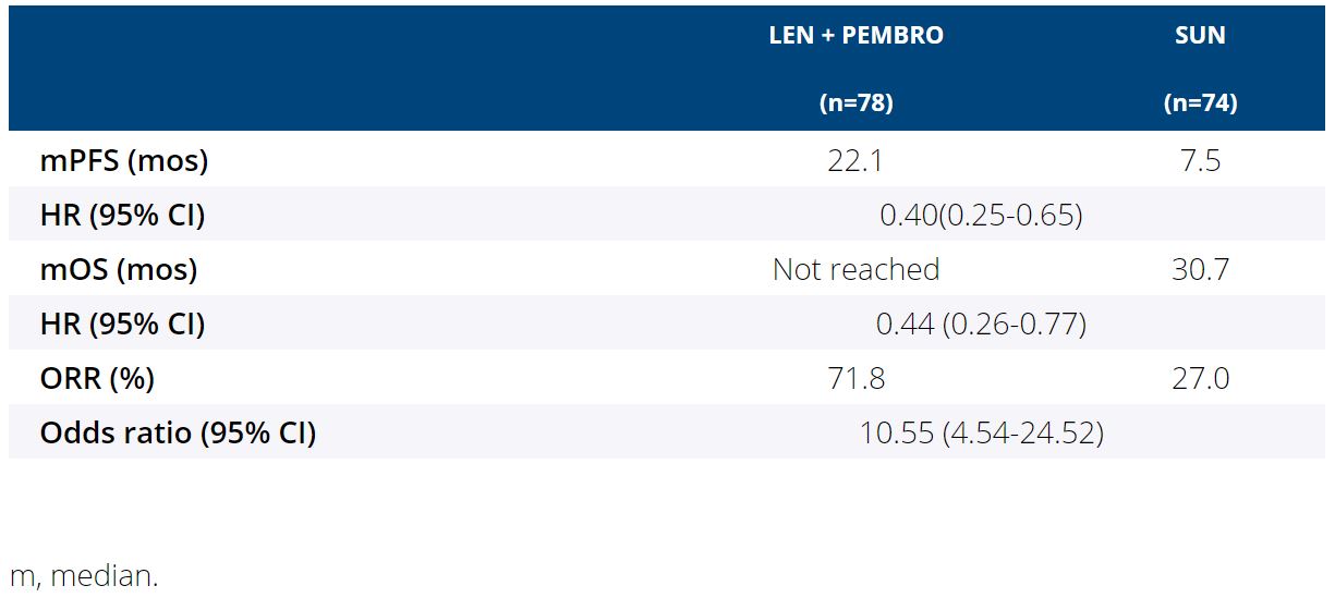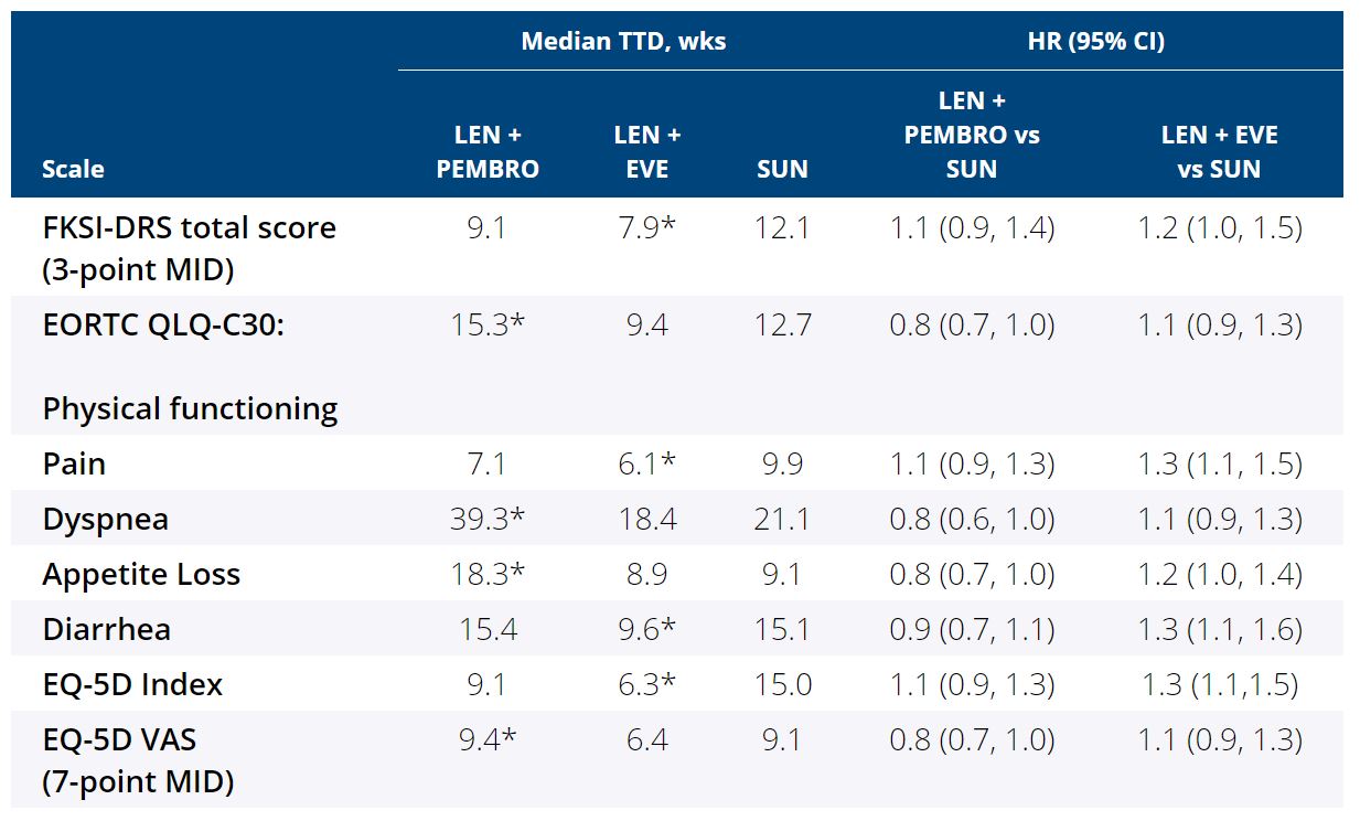 Results: For comparisons of LEN + PEMBRO vs SUN, overall changes from baseline at mean follow-up (wk 46) favored LEN + PEMBRO with significant differences between treatments for physical functioning (least squares mean difference [LS MD] [95% CI]: 3.0 [0.5, 5.5]) and fatigue (−2.8 [−5.5, −0.1]), dyspnea (−2.8 [−5.3, −0.3]), and constipation (−2.2 [−4.2, −0.2]). LS MD of the FKSI-DRS total score was 0.2 (−0.4, 0.7). For comparisons of LEN + EVE vs SUN, overall changes from baseline at wk 46 favored SUN with significant differences in overall HRQoL (−2.8 [−5.1, −0.5] assessed by the EORTC QLQ-C30 GHS/QoL scale) and pain (2.8 [0.1, 5.5]), appetite loss (4.2 [1.3, 7.1]), and diarrhea (5.3 [2.6, 7.9]). LS MD of the FKSI-DRS total score was −0.4 (−1.0, 0.2). 14 of 18 scales for both LEN + PEMBRO and LEN + EVE vs SUN had no significant differences in LS MD comparisons. The LEN + PEMBRO arm is favored over SUN for the median time to first deterioration (TTD) for physical functioning, dyspnea, appetite loss and EQ-5D VAS (Table). 15 of 19 scales for both LEN + PEMBRO and LEN + EVE vs SUN had no significant differences in TTD comparisons.