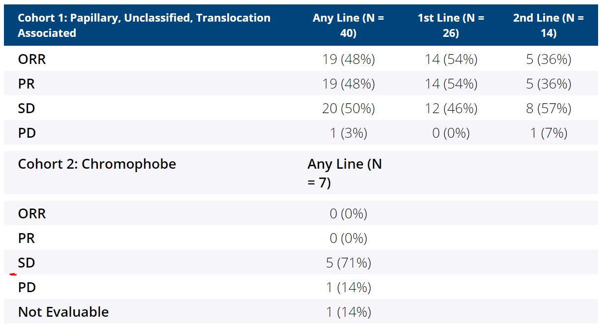 Methods: Pts had advanced non-clear cell RCC, 0 or 1 prior systemic therapies excluding prior immune checkpoint inhibitors, and measurable disease by RECIST. Cabo 40 mg/day plus Nivo 240 mg every 2 weeks or 480 mg every 4 weeks was given across two cohorts. Cohort 1: papillary, unclassified, or translocation associated RCC; Cohort 2: chromophobe RCC. The primary endpoint was ORR by RECIST; secondary endpoints included PFS, OS, and safety. Cohort 1 was a single stage design that met its primary endpoint and was expanded to produce more precise estimates of ORR. Cohort 2 was a Simon two-stage design that closed early for lack of efficacy. Correlative analyses by next generation sequencing were performed and to be presented.