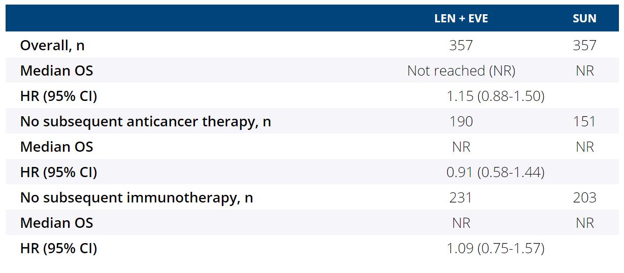 Among 1069 pts with advanced RCC randomized in the CLEAR study, 714 pts were randomly assigned to the LEN + EVE and SUN arms (N=357/each). The median duration of survival follow-up was 27 months in the LEN + EVE arm and 26 months in the SUN arm. Given the shorter median duration of study treatment with SUN (7.8 months) vs LEN + EVE (11.0 months), more pts in the SUN arm received subsequent anticancer therapy during survival follow-up (LEN + EVE, n=167; SUN, n=206). Among pts who received subsequent therapy, pts in the LEN + EVE arm had a longer median time from randomization to initiation of subsequent therapy vs those in the SUN arm (8.0 vs 6.6 months, respectively). OS for the overall population, for pts with no subsequent anticancer therapy, and for pts with no subsequent immunotherapy is shown in the table. In the US population subgroup (LEN + EVE, n=62; SUN, n=61) of the CLEAR study, in which a similar number of pts received subsequent systemic anticancer therapies in the LEN + EVE vs SUN arms (62.9% vs 65.6%, respectively), OS was comparable among the 2 arms (HR 0.95, 95% CI 0.51-1.76). Overall, the safety profile was consistent with the known safety profiles of LEN + EVE and SUN. In both arms, most treatment-emergent deaths were due to progressive disease; there were few treatment-related deaths (<1%, per arm) and no clustering of events.Conclusions:
