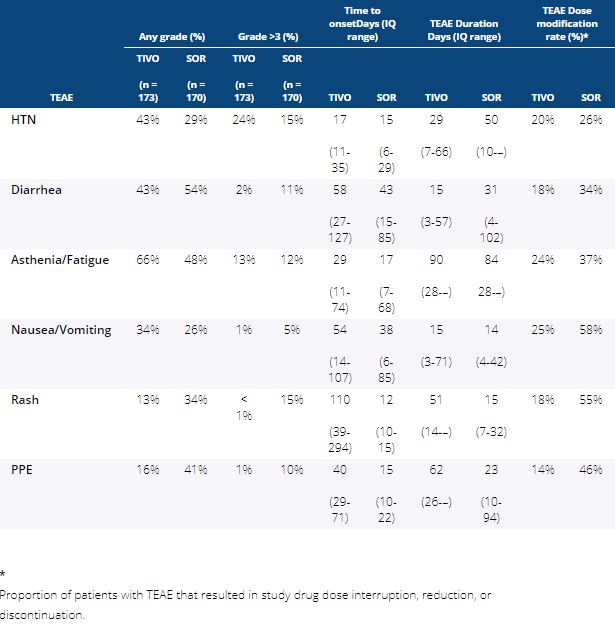 Methods:Updated safety from the previously reported TIVO-3 study with a data cutoff August 15, 2019, was analyzed by treatment arm for time-to-onset (TTO, days [d]) of the most commonly reported TEAEs, and TTO of first dose reduction, interruption, and discontinuation occurring with TIVO and SOR. Duration of TEAE (median d and IQ range), and rate of dose reduction, interruption, or discontinuation due to the TEAE was calculated for each arm.