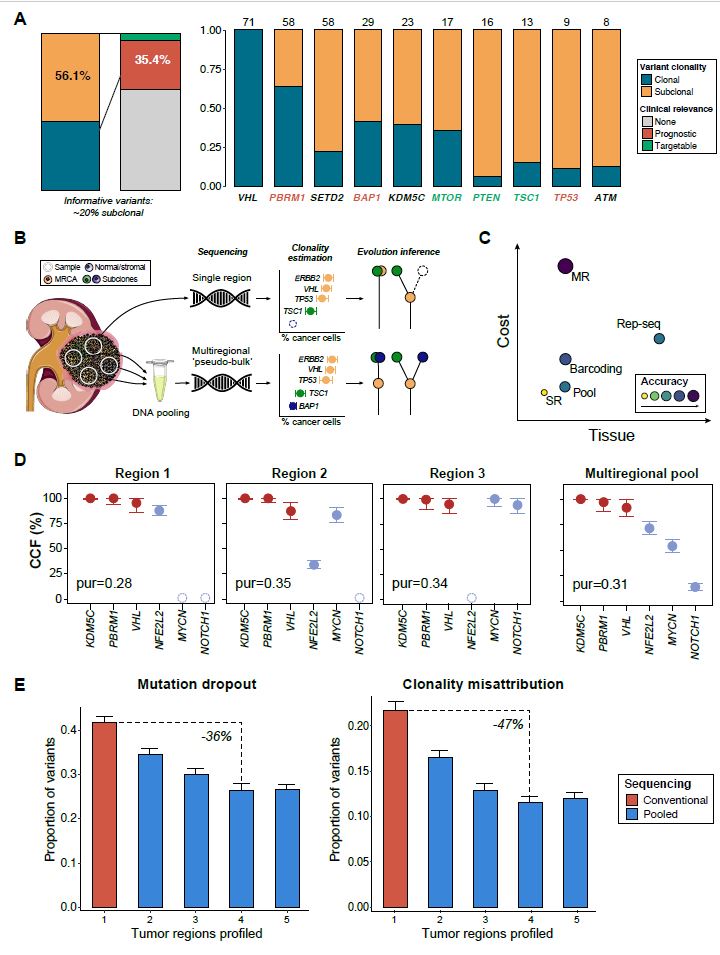 Clear cell renal cell carcinoma (ccRCC), the most common and aggressive form of kidney cancer, is characterized by extensive intratumoral heterogeneity (ITH) whereby driver mutations frequently arise only in a subset of tumor cells [1–3]. As a result of ITH, clinically informative but subclonal mutations are commonly missed by the standard practice (at our institution [4] and others [5]) of sequencing single tumor regions. In a landmark multiregional sequencing study of 101 ccRCC tumors, the TRACERx consortium reported that fifty-six percent of all detected mutations were subclonal [6], and ~20% of subclonal mutations had demonstrable clinical value either for prognostication in clinical risk models (TP53, BAP1, and PBRM1) [7], or as criteria for administration of targeted therapy (MTOR, TSC1, and PTEN) [8] (Figure 1a). Single region sequencing places a hard constraint on the sensitivity to detect and study mutations for two reasons: somatic mutation dropout (i.e. absence of a mutation in the particular tumor region sampled) and erroneous clonality assertions (i.e. attributing mutations as clonal when in fact they are only subclonal, or vice versa). Multiregional sequencing strategies address ITH by sequencing the genomic material of several spatially-separated regions of the same tumor[9]. However, due to the added sequencing expenses, this approach becomes prohibitively costly as the number of regions increases, limiting its use in practice.