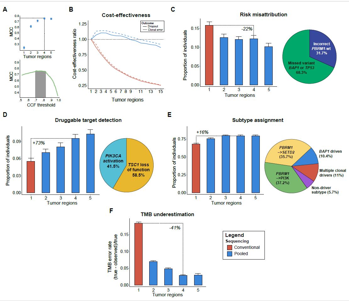 Intratumoral heterogeneity is a fundamental hurdle in the genomically-informed delivery of care to cancer patients. In ccRCC, such heterogeneity is so pervasive that it confounds the accurate identification of the small set of driver mutations of therapeutic relevance. Our proposed approach of direct pooled DNA sequencing from several tumor regions overcomes some of these issues at a fraction of the cost of bona fide multiregional profiling; and it does so without excess use of precious tissue material, preserving it for subsequent profiling studies. Pooling thus represents a viable and cost-effective strategy to overcome ITH during clinical sequencing. Importantly, the overhead costs for both single region and pooled sequencing, including sample acquisition, data handling, storage, and analysis, are largely the same, as the size of the sequencing library remains identical. Furthermore, multiregional DNA pooling allows for the inclusion of additional processing steps before sequencing, providing an extra degree of flexibility when adjusting this approach to different clinical scenarios. Finally, by mixing regions of variable purity, we also envision that pooled sequencing may ameliorate the ~3% of tumor samples (~300/10,000 per year total) which currently fail clinical sequencing at our institution due to excessively low tumor purity, thus increasing resource utilization efficiency [16].
