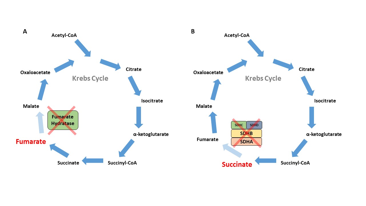 Herein, we will focus on hereditary leiomyomatosis and RCC (HLRCC) and SDH-deficient kidney cancer (also known as hereditary paraganglioma and pheochromocytoma), as these two conditions are characterized by Krebs cycle dysfunction, accumulation of oncometabolites, and subsequent predisposition of affected individuals to various malignancies6. This link between mitochondrial physiology and tumorigenesis was first observed in the 1920s by Otto Warburg7 Accordingly, the genes encoding the Krebs cycle enzymes fumarate hydratase (FH) and the succinate dehydrogenase complex (SDHA, SDHB, SDHC, SDHD as well as SDHAF2 which encodes a protein essential for complex assembly) act as tumor suppressors, with germline mutations in these genes leading to accumulation of fumarate and succinate, respectively8 These deficits in mitochondrial respiration have been linked to tumorigenesis via several proposed mechanisms. Accumulation of fumarate and succinate as oncometabolites has been shown to inhibit the degradation of HIF1, leading to a state of pseudohypoxia and subsequent downstream gene expression leading to tumorigenesis. Concurrently, excessive fumarate and succinate accumulation leads to DNA and histone methylation, resulting in altered gene expression via epigenetic silencing9-11. More recent work has demonstrated that oncometabolite- induced disruption of chromatin signaling leads to an intrinsic homologous recombination DNA repair defect and perhaps further mutational burden. Such findings suggest that FHand SDH-deficient RCC may represent unique forms of kidney cancer that require different therapeutic approaches.