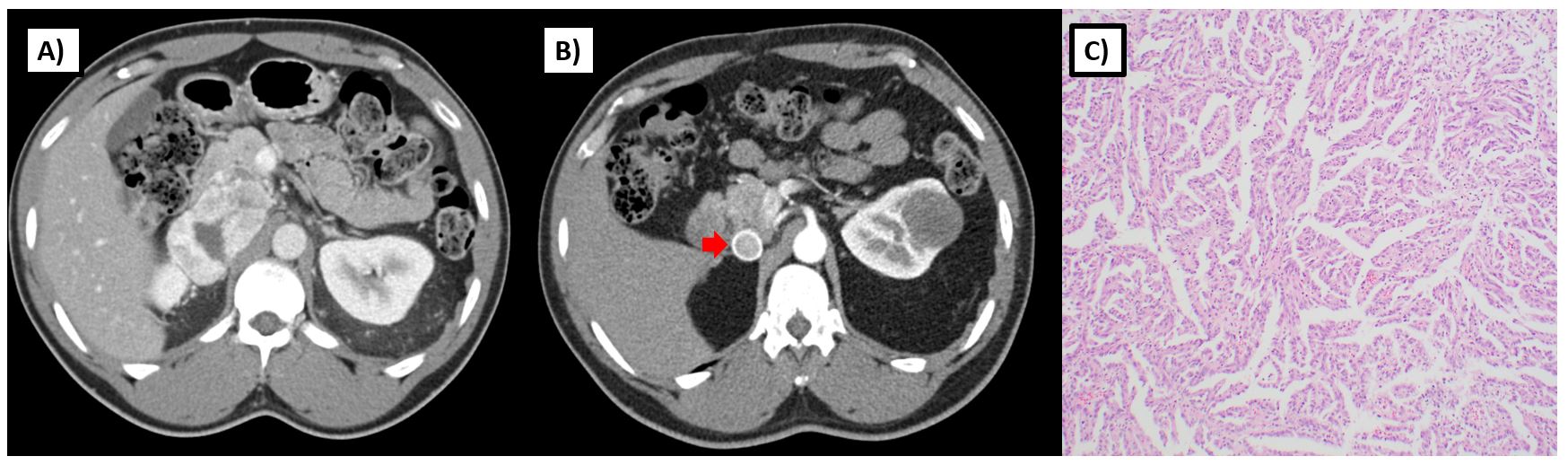 SDH is an enzyme complex that is composed of four subunits (SDHA, SDHB, SDHC, SDHD) and assembled with SDHAF1 and SDHAF2 mitochondrial proteins. This enzyme plays a critical role in mitochondrial respiration; specifically, it catalyzes the oxidation of succinate to fumarate within the Krebs cycle and is also critical to complex 2 of the electron transport chain (Figure 1B). Those with germline loss of function mutations in one of these SDH genes are at risk for paragangliomas, pheochromocytomas, gastrointestinal stromal tumors (GIST), and RCC.28 RCC has been reported in individuals with SDHB, SDHC, and SDHD mutations, and more recently, in patients with SDHA mutations29. Histology can be variable and may depend on the subunit affected. SDHB-deficient tumors are characterized by a unique oncocytic and vacuolated appearance. By contrast, SDHC-deficient tumors tend to present with clear cell histology28,30. Various other histologies, including papillary, sarcomatoid, and unclassified RCCs have been reported in patients with germline mutations of SDH subunit genes (Figure 3).