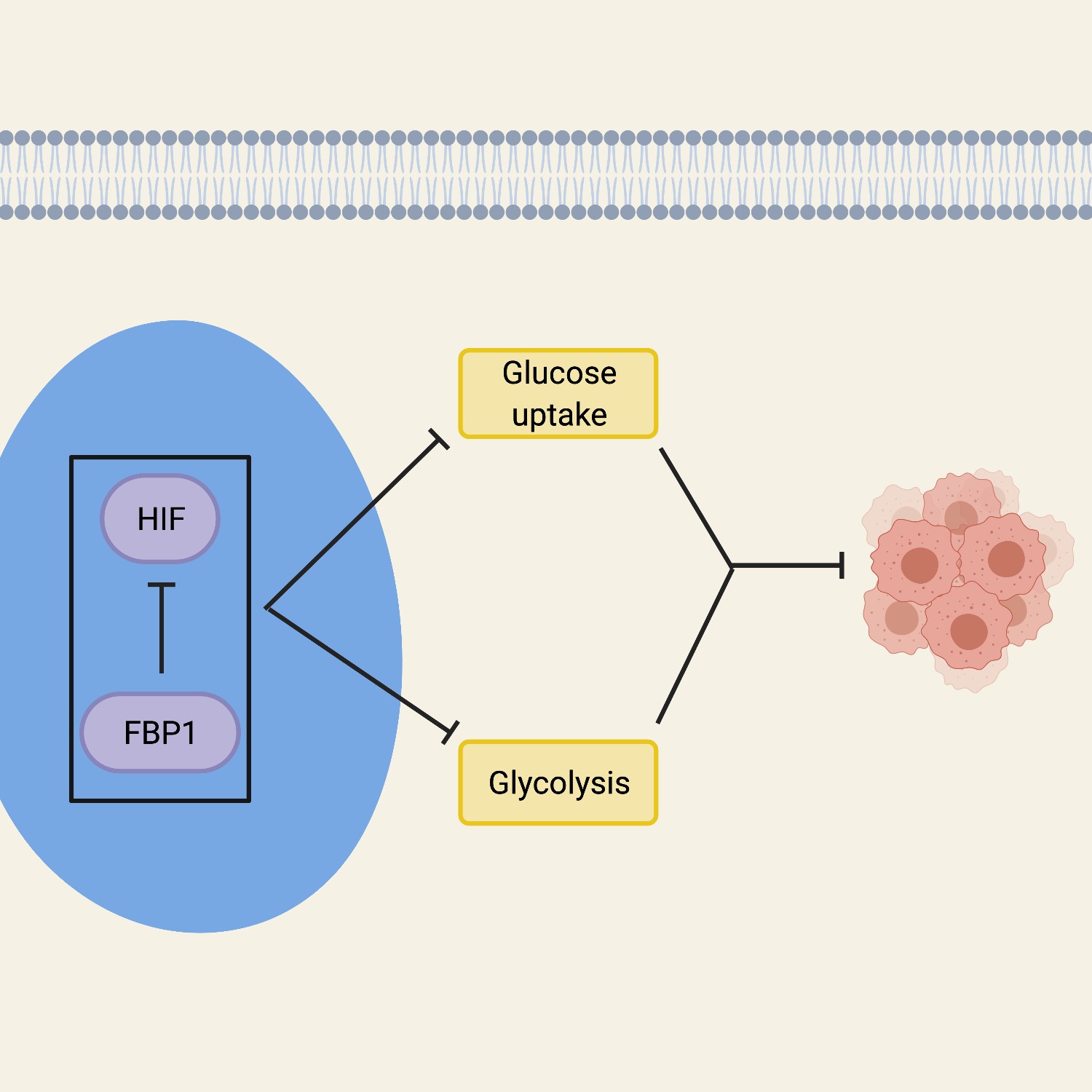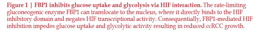 In addition to factors that promote the expression and activity of glycolytic enzymes for energy generation, several cellular modifications have been observed which suggest the regulation of this bioenergetic pathway is tightly controlled. Fructose-1,6- bisphosphatase 1 (FBP1) is a rate-limiting gluconeogenic enzyme that plays a large role in glucose metabolism and inhibits HIF proteins in the nucleus54, 60. FBP1 opposes ccRCC by inhibiting glycolysis and cell proliferation in cells52, 60. Inhibition of FBP1 increases glucose uptake and, therefore, allows tumor growth to progress. Evidence supported by cellular fractionation and immunofluorescent staining suggests that FBP1 suppresses HIF proteins in the nucleus, and showed that an interaction between FBP1 and HIF proteins is necessary for an effect on glucose metabolism60. This was further proven by using a nuclear-excluded form of FBP1 which failed to inhibit the HIF proteins in the cell, showing that the effects of FBP1 inhibition originate in the nucleus60. Overall, the FBP1 activity in the cell that affects the growth and development of tumors, works by regulating HIF from the nucleus. The inhibition of FBP1 promotes glycolytic functions, thereby enhancing the Warburg effect, while simultaneously failing to suppress nuclear HIF function, both of which is associated with poor prognosis in ccRCC (Figure 1).