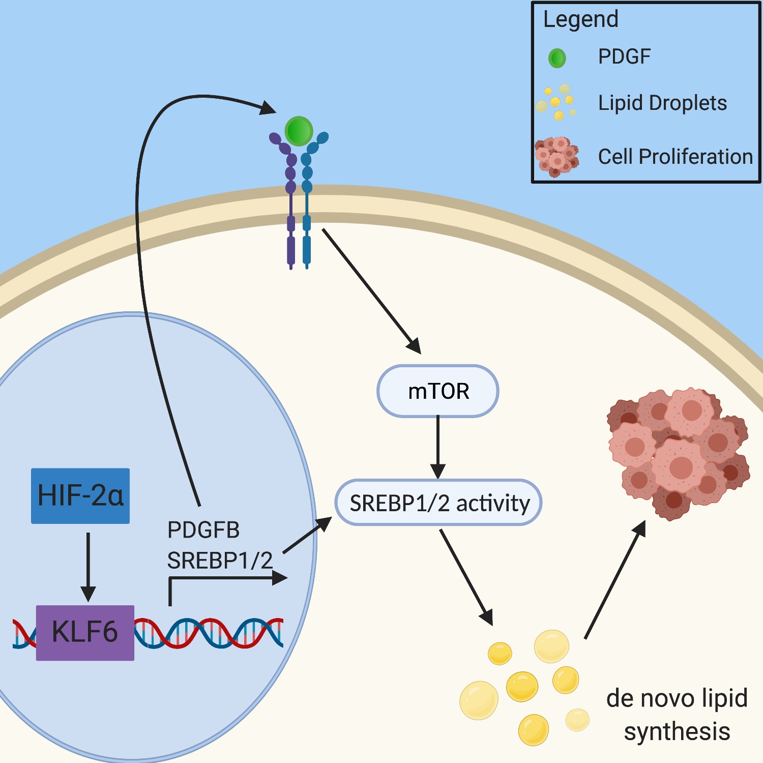 mTOR signaling through mTORC1 also regulates SREBP1 and SREBP2. Investigations into the interaction between mTORC1 and KLF6 revealed that KLF6 both directly interacts with SREBP1 and SREBP2, and promotes mTOR signaling by enhancing platelet-derived growth factor subunit B (PDGFB); both of these factors contribute to an increase in lipid metabolism and anabolic signaling, resulting in increased tumor growth64 (Figure 2). SREBP acts by inducing the production of enzymes involved in cholesterol and lipid synthesis, including the rate-limiting enzyme of cholesterol synthesis, 3-hydroxy-3-methyl-glutaryl-coenzyme A reductase (HMGCR)65–67. A recent study showed that the gene TRC8 represses the translation of these key transcription factors, therefore inhibiting lipid and cholesterol synthesis, which makes it a target for future investigation65.