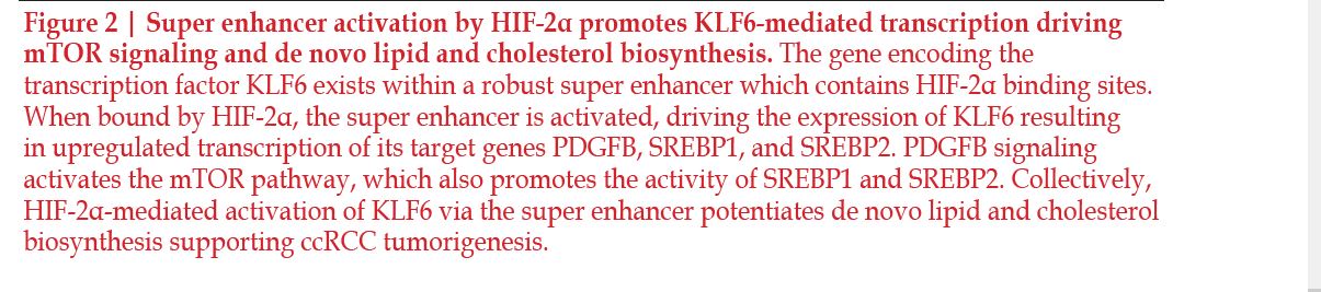One regulator of interest is Kruppel life factor 6 (KLF6). KLF6 is a zinc finger family transcription factor that was shown to have effects on lipid metabolism64 and has been implicated as a tumor promoting factor in ccRCC via its effects on cell proliferation and high levels of expression. The gene encoding this transcription factor was found to be located within a locus containing one of the strongest super enhancers. Additionally, this association was linked to enhanced KLF6 expression when comparing ccRCC samples to adjacent normal tissue, as well as to other solid tumors lacking this super enhancer. The Cancer Genome Atlas data of ccRCC showed a correlation between HIF-2α expression and KLF6 expression; this study investigated this interaction through VHL reintroduction experiments64. The reintroduction of VHL caused a decrease in mRNA expression of KLF6 and, using ChIPseq, they showed that VHL introduction caused a decrease in activity in the region where the super enhancer is located64. Additionally, the ChIP-seq data show that HIF-2α was bound at this same region64. This indicates that HIF-2α is an activator of this super enhancer, so when HIF-2α is present, it binds to the super enhancer and there is robust transcription of KLF6. To expand on their findings, the researchers next assessed the impact of altering KLF6 expression in ccRCC. Pathway analysis was performed on RNA-seq data collected from cells depleted of KLF6 and revealed a significant downregulation of lipid and cholesterol metabolism pathways64. Specifically, they identified sterol regulatory element binding protein 1 and 2 (SREBP1 and SREBP2), master transcriptional regulators of lipid signaling, were downregulated in response to KLF6 suppression. These findings were validated with qPCR experiments, where it was observed that SREBP1, SREBP2, and several of their downstream targets were downregulated in response to KLF6 inhibition. Importantly, these results translated further into an overall decrease in intracellular cholesterol and lipids when KLF6 is depleted. These studies elegantly display the critical role HIF-2α plays in regulating KLF6, an essential piece of lipid and cholesterol metabolism in ccRCC.
