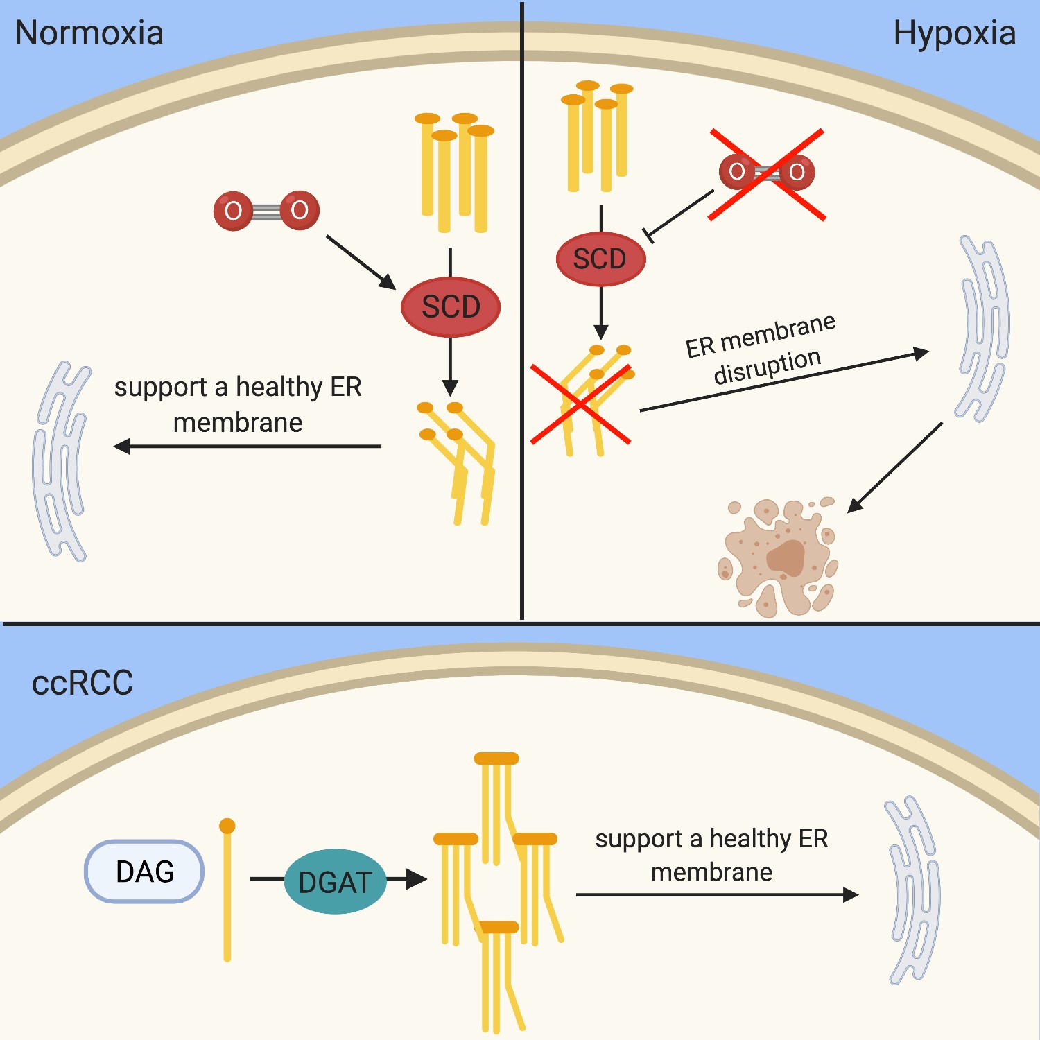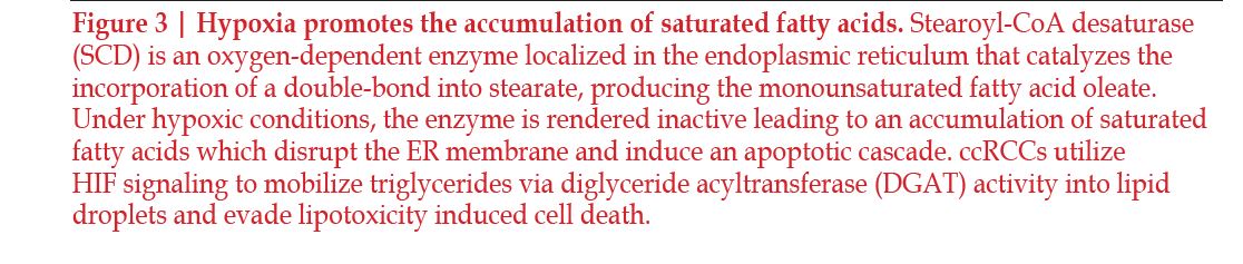 The clear cell phenotype is characterized by lipid buildup, but recent studies have shown that high-density lipoprotein (HDL) cholesterol is accumulated in the highest levels within ccRCC tissues. HDL-cholesterol is also seen in higher amount in ccRCC tumoral cells compared the surrounding non-malignant kidney tissues71–73. The deregulation of cholesterol compounds with the accumulation of other lipids to stabilize the membrane of the tumoral cells and increases tumorigenesis when it cannot be regulated properly. In multiple studies, cholesterol synthesis did not appear to be affected, which suggests that the cholesterol buildup seen within the cells is due to exogenous cholesterol influx and endogenous cholesterol efflux71, 74. Cholesterol was also discovered to play a role in promoting metastasis of ccRCC75. Hypoxia effects fatty acid saturation via the oxygen dependent enzyme stearoyl-CoA desaturase (SCD). SCD under hypoxic conditions is inhibited, which leads to a buildup of fatty acid precursors in the cell76. This leads to disruption of the endoplasmic reticulum and induces apoptosis76–78 (Figure 3).