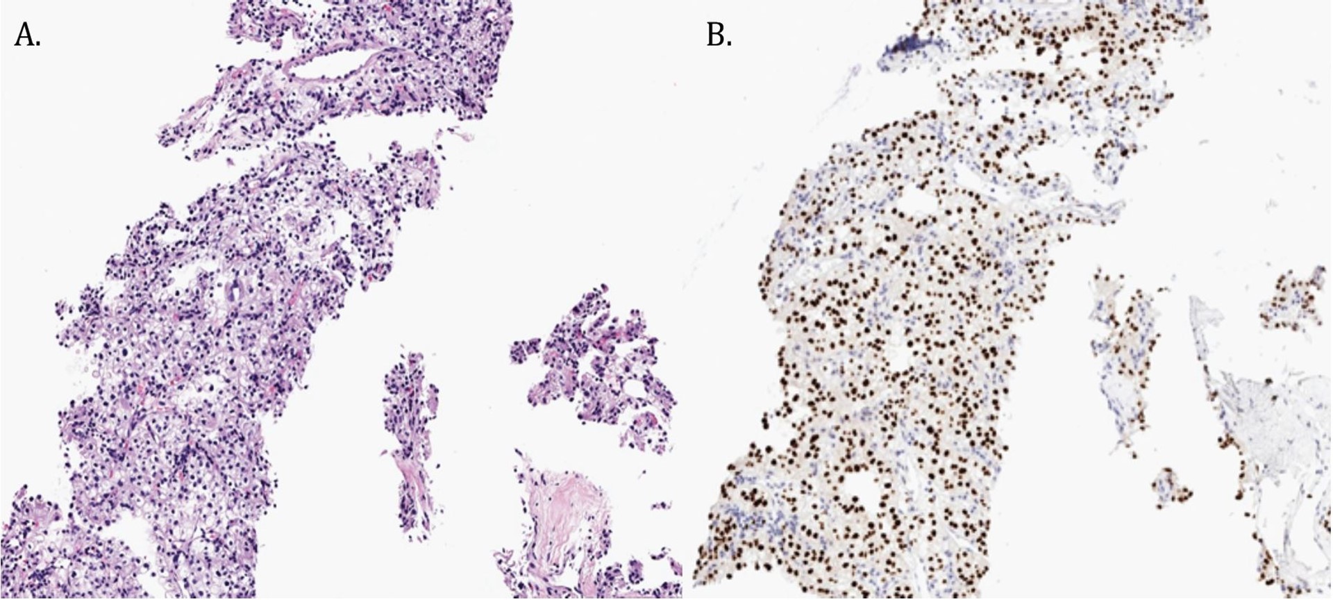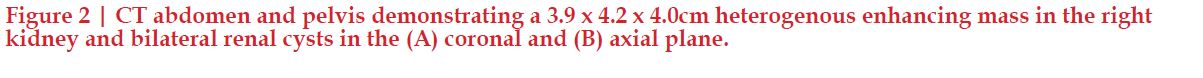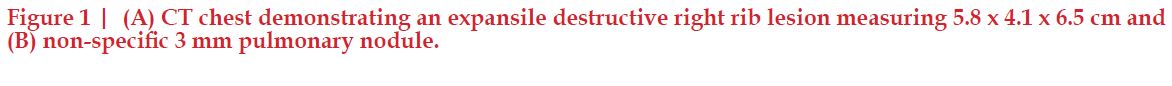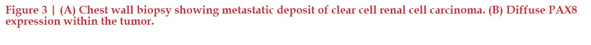 Work-up of the right chest wall mass included a CT chest which demonstrated an expansile destructive right rib lesion measuring 5.8 x 4.1 x 6.5 cm and a nonspecific 3mm pulmonary nodule (Figure 1). A CT-guided biopsy of the chest wall mass was most consistent with clear cell RCC (Figure 3). Subsequent CT of his abdomen demonstrated a 3.9 x 4.2 x 4.0 cm heterogenous exophytic right renal mass (Figure 2). The patient denied gross hematuria, unintentional weight loss, constitutional symptoms, and pain. His physical exam was remarkable for a palpably firm right chest wall mass, and lab data revealed normal serum hemoglobin, absolute neutrophil count, platelets, and calcium. With his excellent performance status and normal lab results he was assigned to the intermediate risk group as per the International Metastatic RCC Database Consortium (IMDC) prognostic model13. Notably, he had mild baseline chronic kidney disease with a serum creatinine of 1.5 and an estimated glomerular filtration rate was 48.2 ml/ min/1.78 m2.