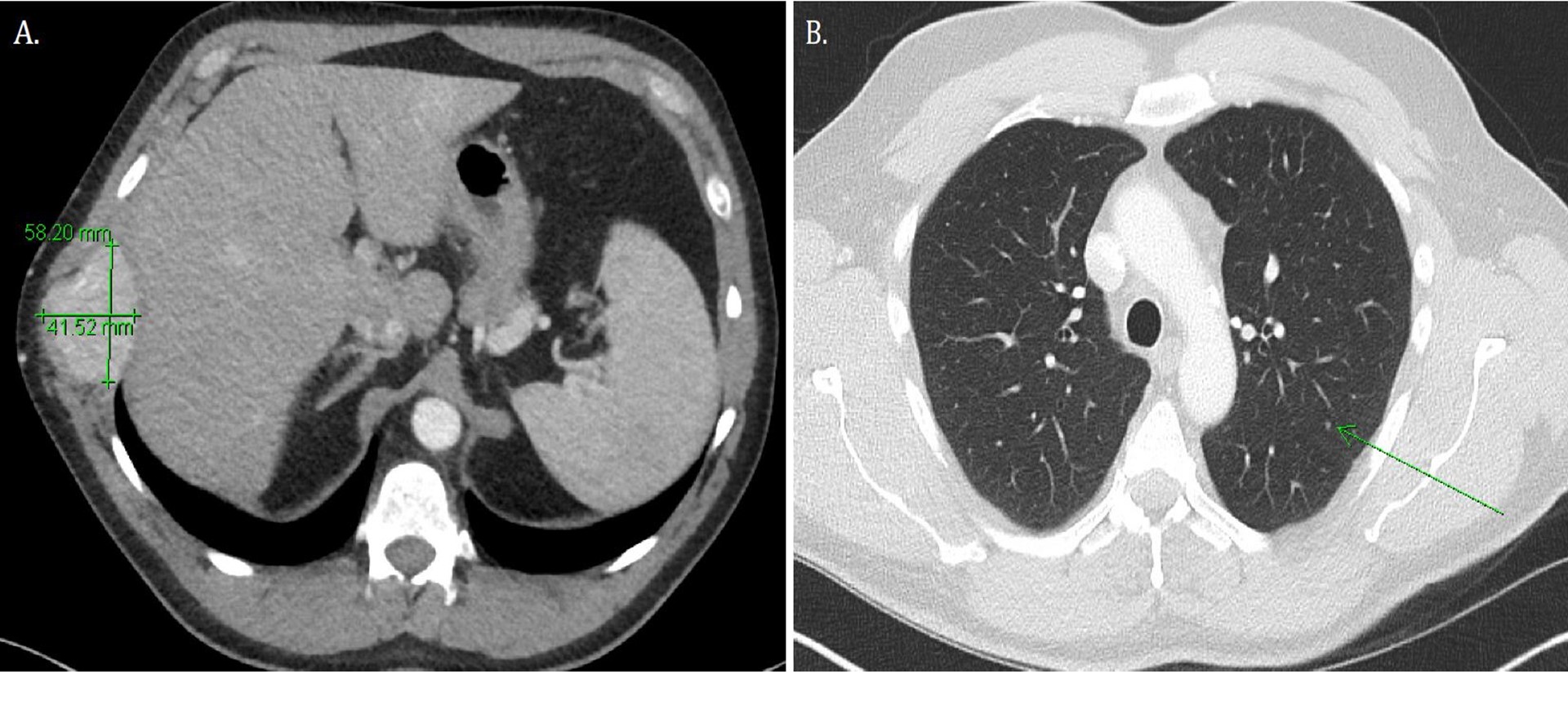 A 57-year-old male initially presented with a one-month history of an enlarging, painless right chest wall mass. His medical and surgical history is significant for hyperlipidemia and diverticulitis for which he previously underwent a sigmoid resection. His family history is remarkable for maternal aunts with non-small cell lung cancer, ovarian cancer, a maternal grandfather with bladder cancer, and a father who died of metastatic prostate cancer. He endorses a 7.5 pack-year smoking history but is not a current smoker.