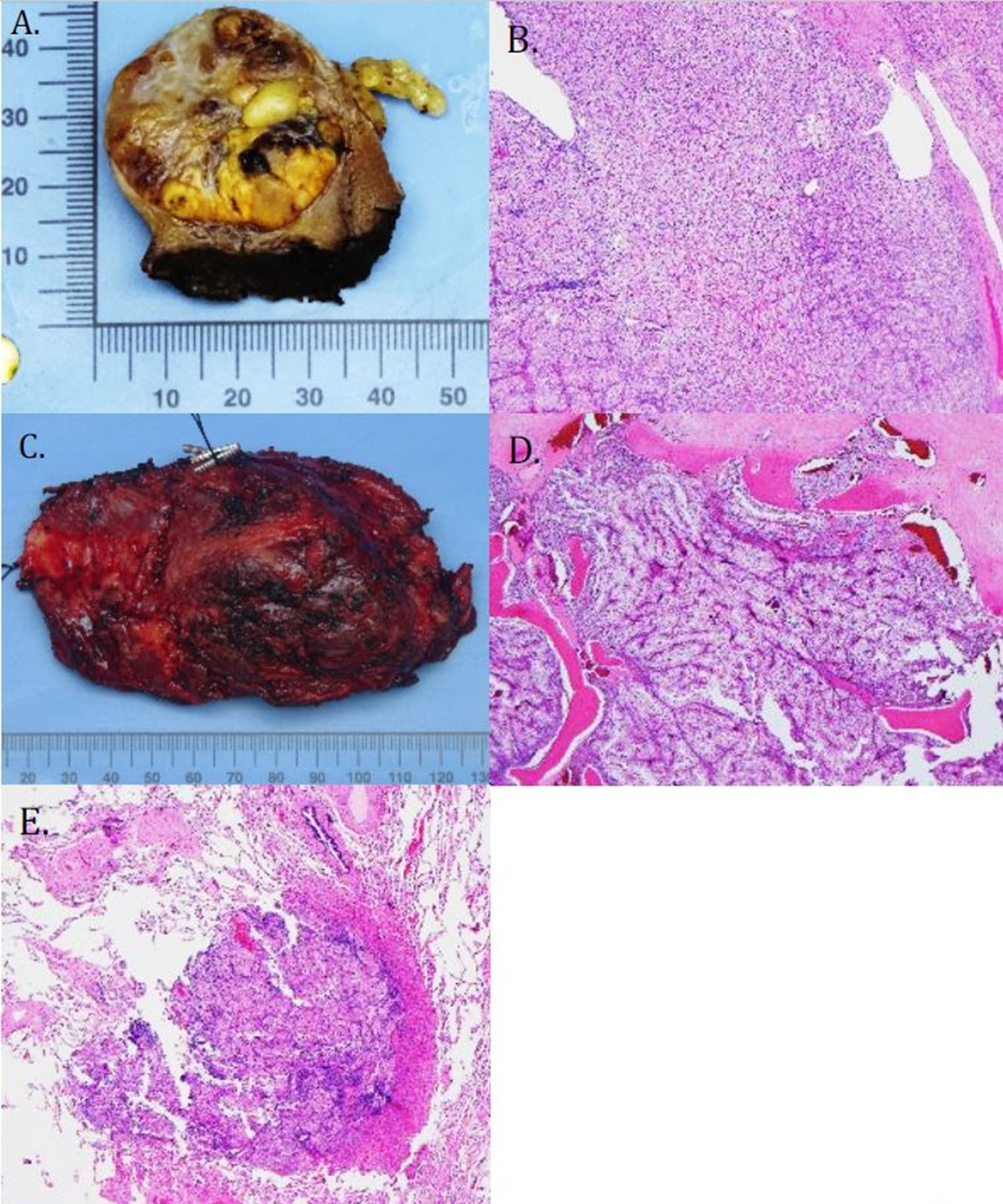 Histopathologic examination of the partial nephrectomy specimen revealed a 5.5 cm clear cell RCC with negative surgical margins, Fuhrman Grade 3. Metastatic RCC was present in the right lower lobe wedge (0.25cm) as well as the chest wall resection (7.4cm) which involved bone, skeletal muscle, and fibroadipose tissue (Figure 4). All surgical margins were negative, and a pathologic stage of pT1bNxM1 was assigned.